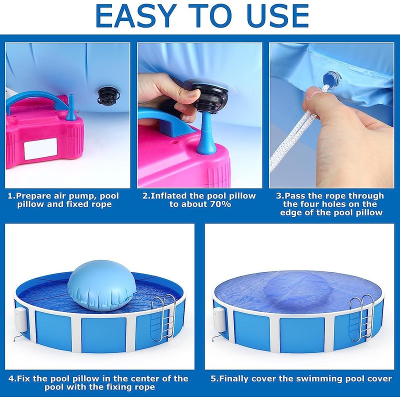 • Easy to Use This inflatable above ground pool cushion is very easy to use, just use the electric air pump commonly used in the family to inflate quickly. Then tie the ropes to the four holes at the edge of the pool cushion and fix it in the middle of the pool. Easy and fast, you can install in ten minutes. Tips: This product does not contain an air pump. Please do not overfill the inflatable pillow.