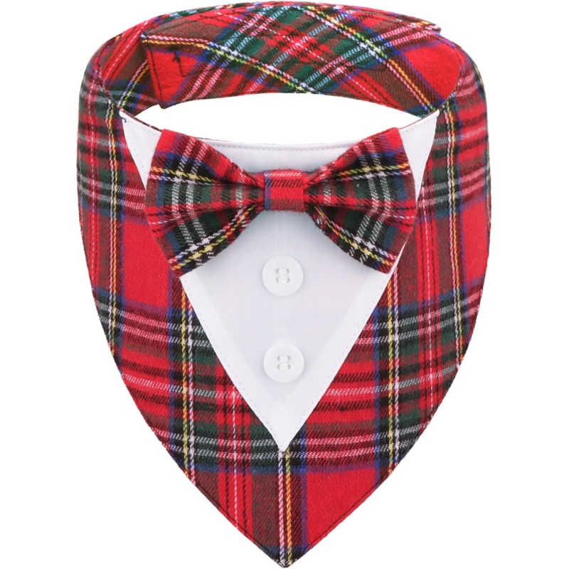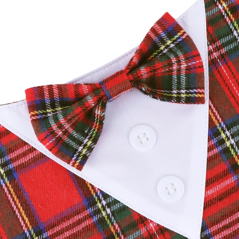 HDGDT Adjustable Red Plaid Christmas Dog Tuxedo Bandana with Bow Tie - Holiday Pet Outfit Costume for Dogs XS to XL