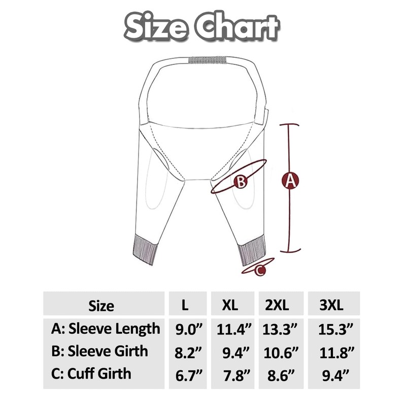 XL: Sleeve Length 11.4 inch, Knee Girth 9.4 inch, Cuff Girth 7.8 inch.