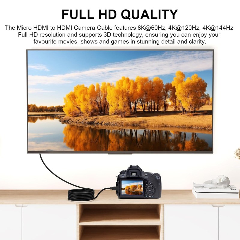 - Volle High-Definition-Qualität: Das Micro-HDMI-auf-HDMI-Kamerakabel verfügt über 8K @ 60Hz, 4K @ 120Hz, 4K @ 144Hz Full-HD-Auflösung mit 3D-Technologie-Unterstützung, damit Sie Ihre Lieblingsfilme, Shows und Spiele in atemberaubenden Details und Klarheit genießen können