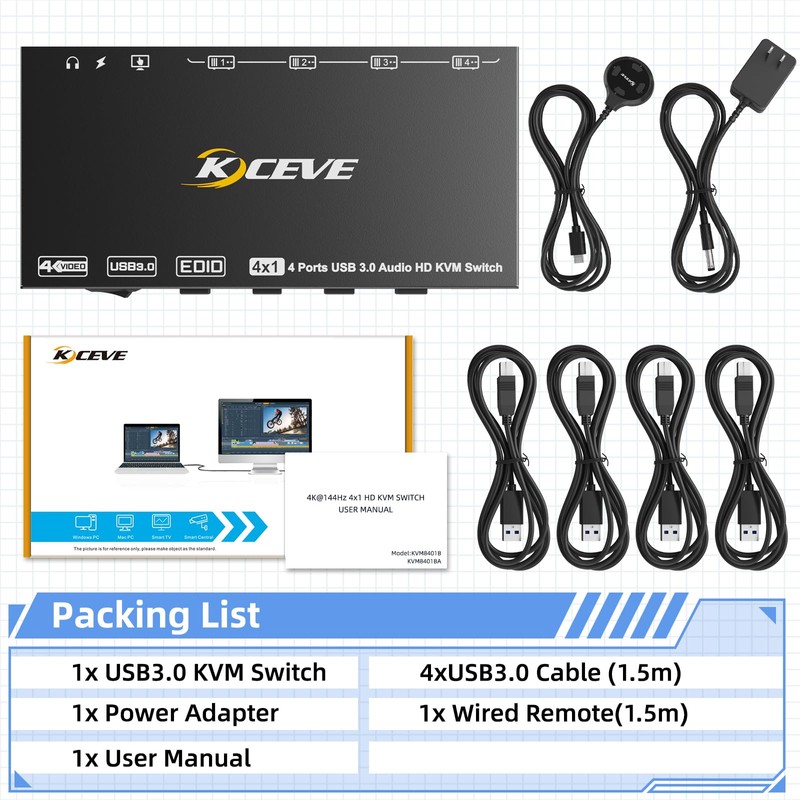 - 【Ultra HD 8K@60Hz 4K@144Hz】USB 3.0 KVM switch HDMI support resolutions up to 8K@60Hz 4K@144Hz, Backwards compatible with 4K@60Hz,1080P and lower resolution.Please use high -quality HDMI2.0/HDMI2.1 cables less than 1.5 meter to connect KVM. tip: This 4 port HDMI KVM switch also work with ultrawide monitors.