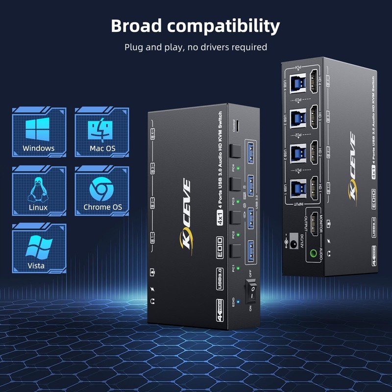 - 【 Great Compatibility】This 8K KVM switch driver-free for Windows,Mac OS, Linux and Chrome OS.KVM HDMI support PS5, Desktops, Laptops.Applied for office,home,teaching,games, etc. Camgeet provides 1 year war-ranty for this USB 3.0 KVM Switch.Package List:1*KVM switch,4*USB 3.0 Cable.1*Wired Remote,1*Power adapter.
