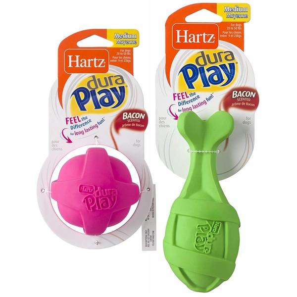 Feel the difference with Dura Play natural latex dog toys. Each toy provides long-lasting fun utilizing foam technology that enhances durability, creating an unmatched chew experience with an enticing bacon scent dogs go crazy for. Fun to throw and bounce, Dura Play toys even float and are easy to clean. Soft and flexible to the touch, each fun shape is perfect for dogs of all ages. Remember to supervise your pup with any toy