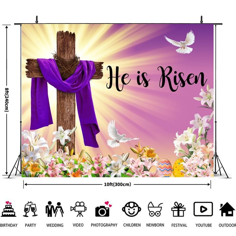He is Risen Backdrop Easter Decorations Banner Jesus Cross Resurrection Religious Background for Spring Easter Party Supplies 10x8ft