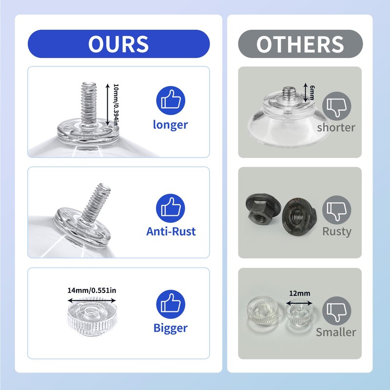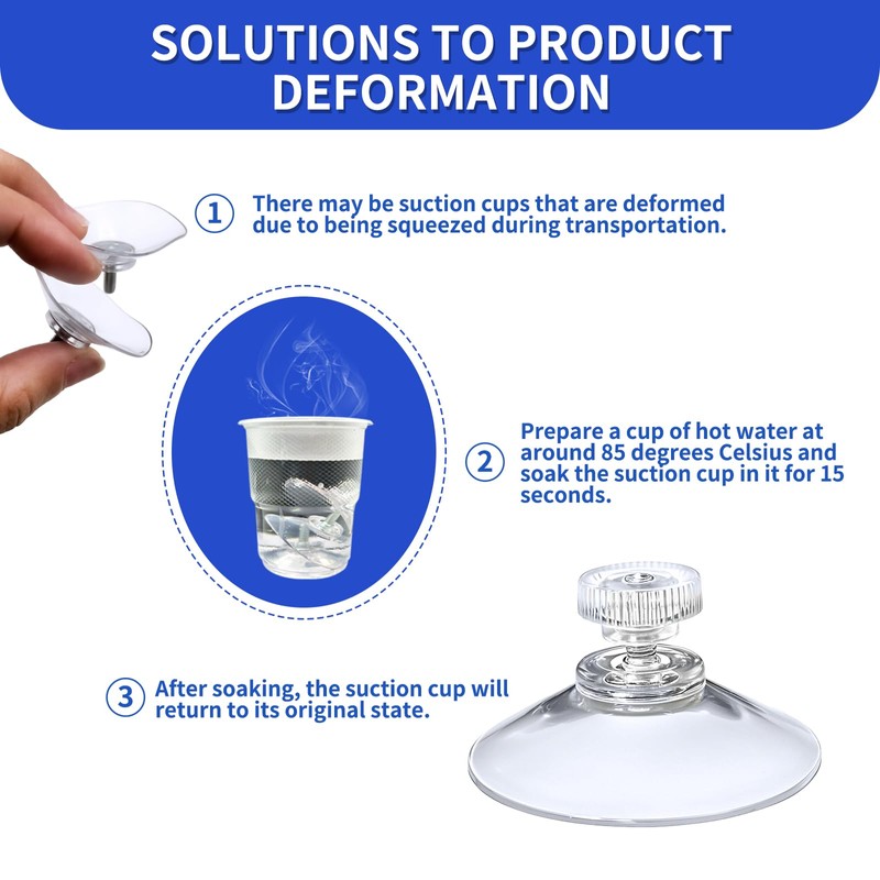 - VERSATILE MOUNTING: Clear plastic suction cups with screw-top design provide secure temporary adhesion to smooth, non-porous surfaces