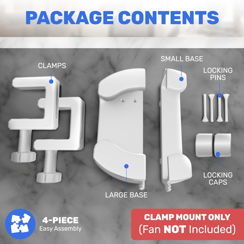 - EASY TOOL-FREE ASSEMBLY: Get cool in minutes! This smart accessory arrives in 4 simple pieces that are incredibly easy to assemble. Just slide your fan into the holder, secure it with the easy-grip knobs, and clamp it onto your bedno tools required.