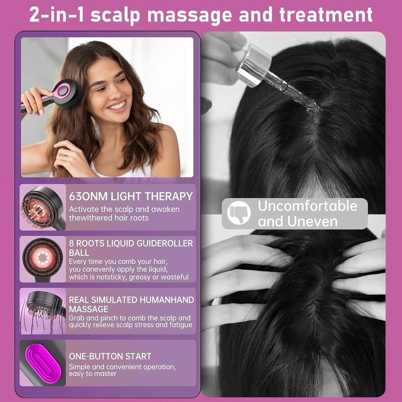 - 2 IN 1 SCALP MASSAGE AND TREATMENT This electric head massager combines the functions of applying essential oils and scalp massage. 66 rounded combs mimic a hand massage for intense scratching and gently massage the scalp. It has an essential oil compartment in the middle and 8 liquid-carrying rollerballs that squeeze out the liquid so you can massage the scalp and apply the essential oils evenly. The gentle oil massage improves blood circulation, relieves stress, relaxes the scalp and effectively nourishes hair and scalp. (Essential oils not included)