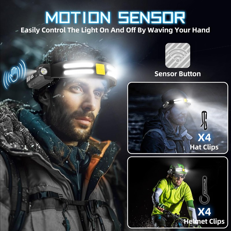 • MULTI-PURPOSE APPLICATION: Our head lamp rechargeable is widely available for any outdoor night activity, from working, cycling, jogging, and dog walking to camping and more, our package contents will provide all you need to start. What You Get: 2x LED Headlamp, 2x USB-C Cable, 1x User Manual, 4x Helmet Clips, 4x Hat Clips