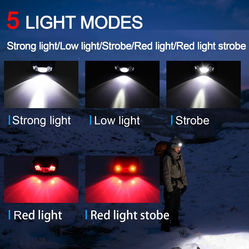 - 【5 kinds of lights & sensor lights】 The headlight has 5 light modes, and the lights are manually controlled: main light strong light / main light weak light / main light strobe / red light strong light / red light strobe. It can be a gesture-sensing sliding control, or a touch control. The power switch can be controlled with a wave of your hand, which is very convenient to use in a dark environment.