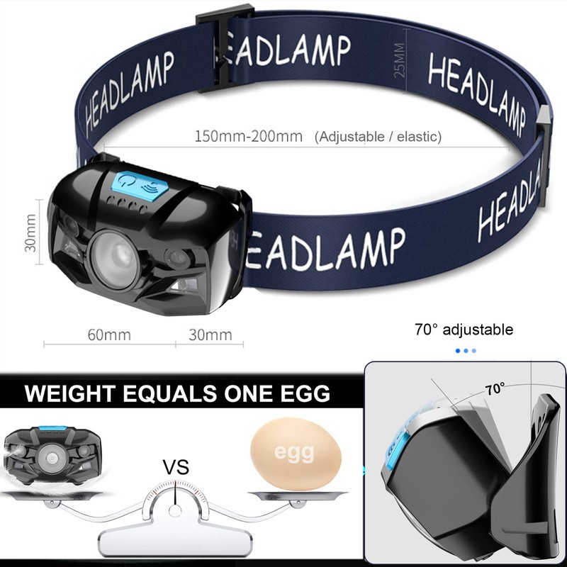 - 【70° Adjustable Headlight】Super light and adjustable, the lamp head can be rotated 70° and fixed firmly, avoiding shaking when running or working. The headlight features a high-quality comfortable elastic band that can be easily adjusted in length to fit an adult or child's head, and can also be mounted on hard hats and helmets.
