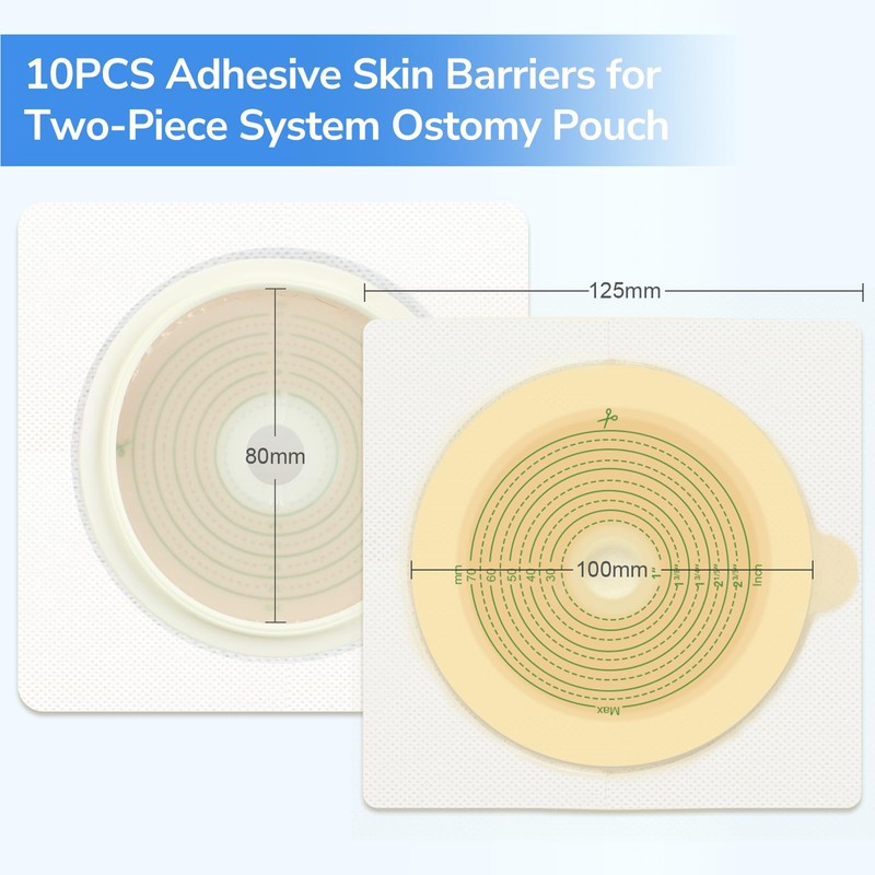 - PACKAGE INCLUDES: Each package contains 10 individually wrapped skin barriers, 1 stoma measurement card and 1 instruction guide. (Please note: The two-piece ostomy bags must be purchased separately)