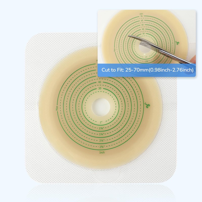 - CUT TO FIT: The skin barrier cutting hole range is 0.98 inches (25 mm) to 2.76 inches (70 mm). You can use the measurement card in the package to measure your stoma and then cut the size to fit your stoma