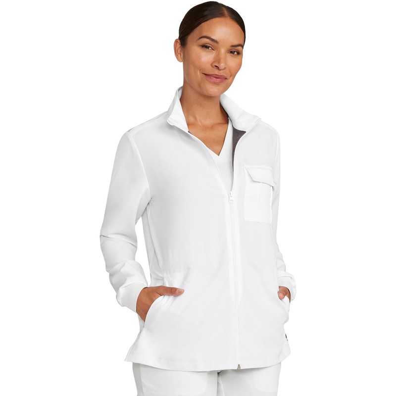 - STYLISH AND PROFESSIONAL LOOK - The Brooks Zip Front Utility scrub jacket offers a sleek and professional appearance with thoughtful design details like a stand-up collar, grosgrain ribbon trim on the shoulders, and a logo zipper pull. The modern fit and center back length of 26 inches create a flattering silhouette, making it the perfect choice for both work and casual wear.
