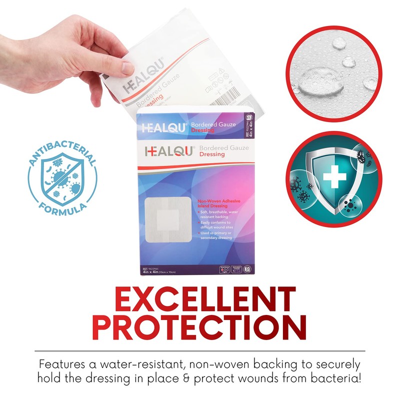 - QUICK & EASY TO USE! Sticky around the edges but not in the middle, Healqu Bordered Gauze Island Dressings protect fresh cuts and scrapes without sticking to the wound, for good protection while healing. Simply peel & stick, and get on with the rest of your day!
