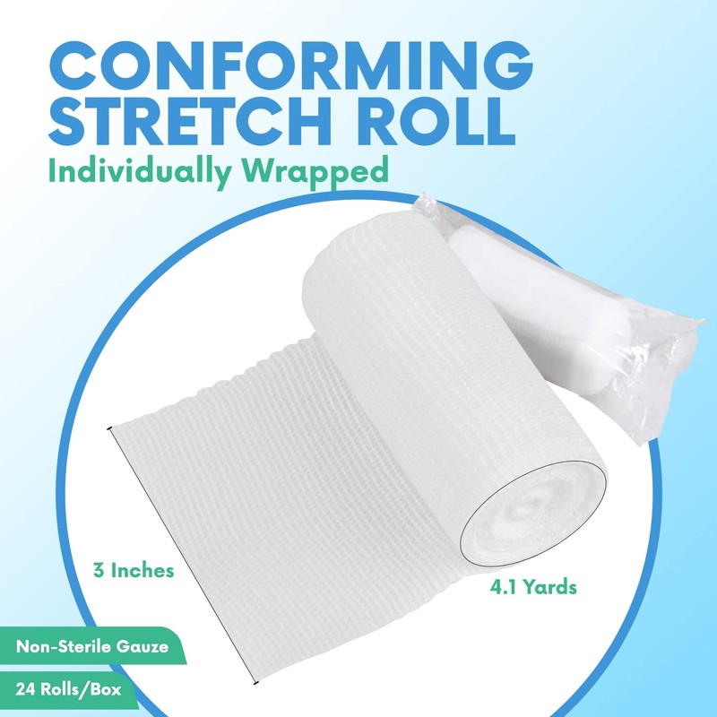 • SOFT AND CONFORMABLE - HEALQU Conforming Stretch Gauze Bandage is a soft and stretchable wrap used to keep a primary wound dressing secured in place and for splint support. It consists of woven polyester gauze material that is breathable and conformable to the body contours.