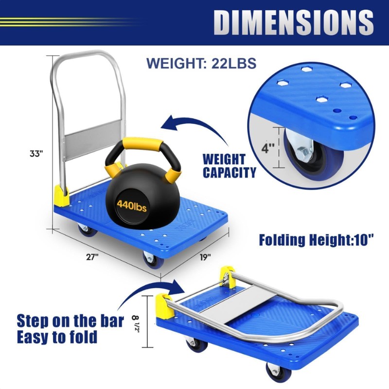 - Generous Size and Specifications: With a platform size of 27.56" x 19.69" and a folded height of approximately 8.5", this dolly offers ample space for large loads. Open Dimensions: 19 x 27 x 33 inches; Folded Dimensions: 19 x 27 x 8.5 inches; Weight: 20 pounds; Maximum Weight Capacity: 440 lbs