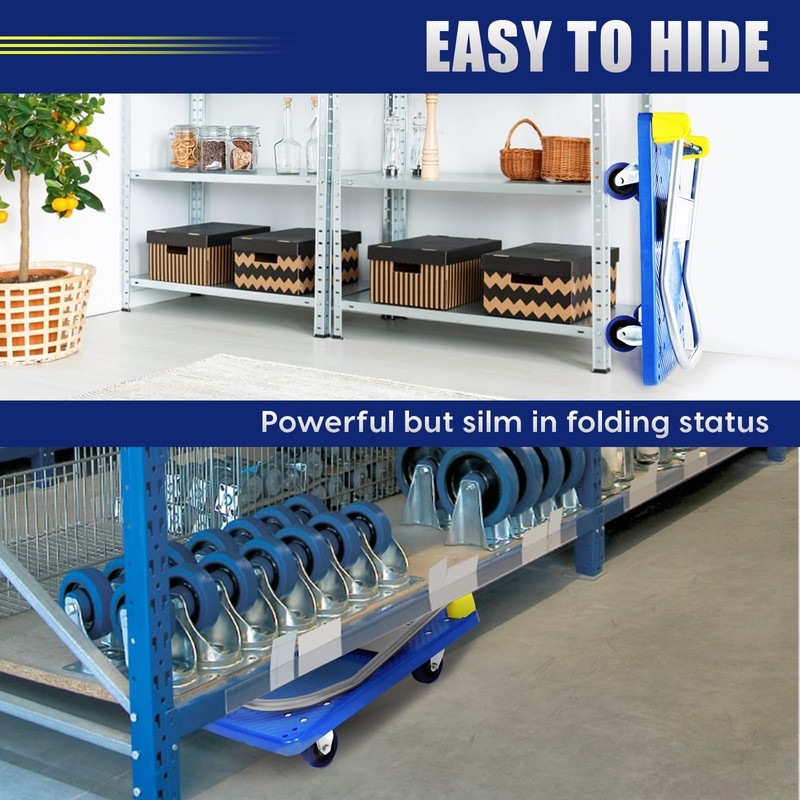 - Space-Saving Design: Our platform push cart folds easily in under 3 seconds with a simple rail push. The idea for compact storage in cars, garages, workshops, or large warehouses. Its versatile design handles various tasks effortlessly.