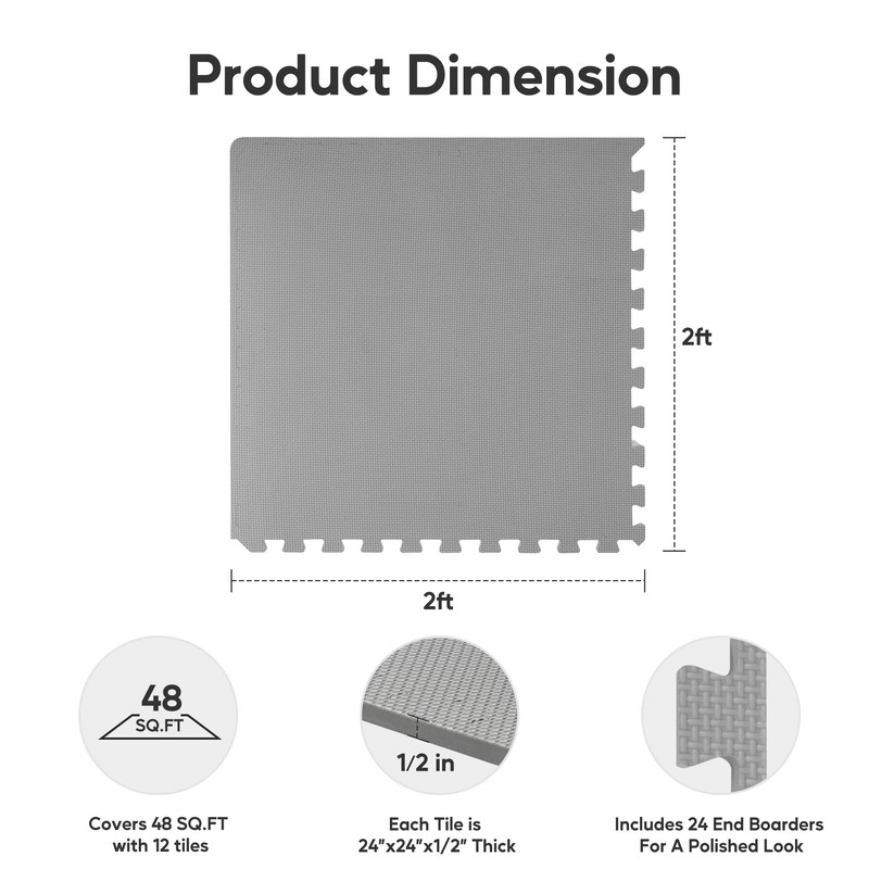 - Cover 48 SQ FT: Each tile measures 24" x 24" x 1/2"-thick. Includes 12 tiles and 24 end borders for a polished look. Ideal choice for weightlifting, stretching, or cardio, ensuring comfort and protection for your gym setup