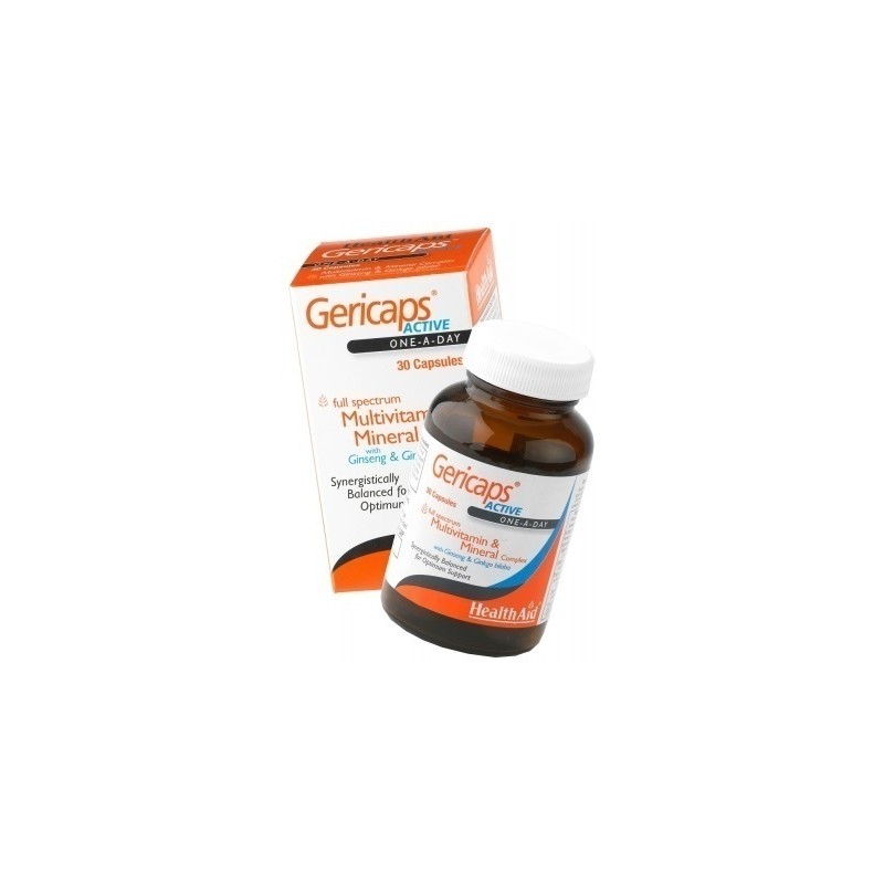 Gericaps Active Capsules are a highly potent and uniquely balanced combination of natural vitamins, minerals and trace elements, with added ginseng and Ginkgo Biloba to help boost energy levels and maintain overall wellbeing. HealthAid Gericaps Active Capsules help revitalise the body, enables a more active lifestyle, maximises energy levels, and helps reduce stress and exhaustion from the day to day routine.