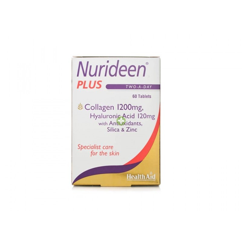 Nurideen Plus Tablets are a unique high strength formulation which combines the benefits of the most well known ingredients for skin health. Hydrolysed Collagen and Silica contribute to the maintanance of a healthy levels of collagen, providing the skin with strength and elasticity; Hyaluronic Acid contributes to the maintenance of moisture and suppleness; Beta-carotene and Vitamin E are powerful antioxidants which contribute to the protection of skin cells from oxidative stress; Vitamin C plays a vital role in collagen production and contributes to the protection of skin fibres essential to support skin structure; Zinc is an essential mineral that helps regulate the activity of the oil glands, keeping the skin looking healthy and radiant.