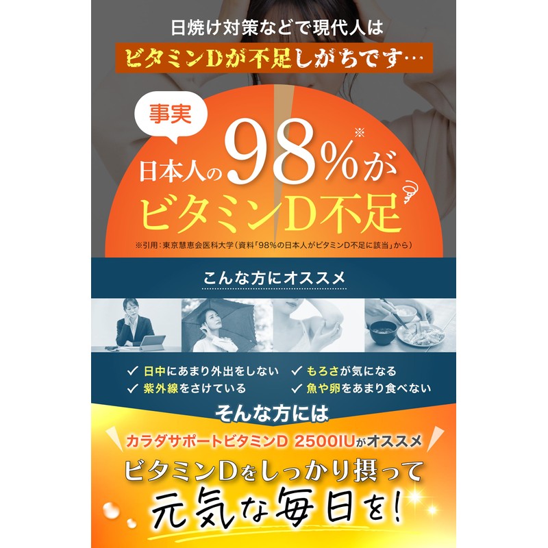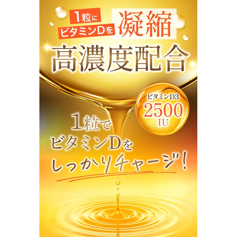 - 🌞【3袋セット】【高濃度ビタミンD 2,500IU配合】日本人に不足しがちなビタミンDを2,500IU高濃度配合したサプリメントです。ビタミンDは主に日光浴をすることにより生成され、健康に欠かせない大切な成分ですが、近年多くの日本人において摂取量が不足していると言われています。ビタミンDをしっかり摂取してカラダやココロもフレッシュな日々を