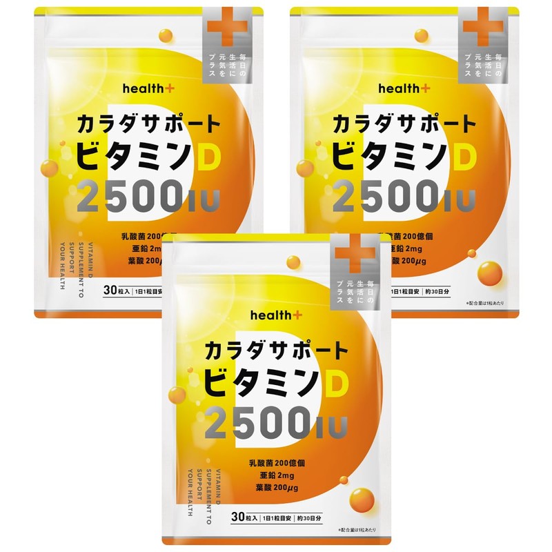 health+ 高濃度ビタミンD 2500IU 1日分のビタミンD 乳酸菌200億個 亜鉛2㎎ 葉酸200μg 30粒 約30日分 GMP国内製造 飲みやすい小粒タイプ 3袋セット