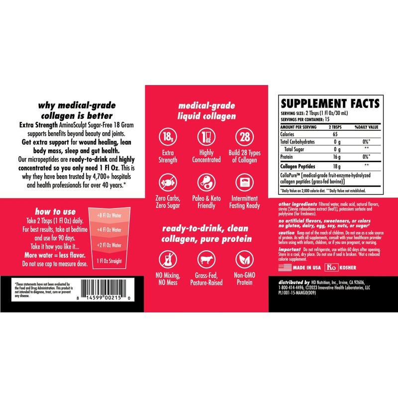 - Medical-Grade Collagen: With 40 years of clinical research and use, AminoSculpt Sugar-Free 18 Gram offers the only Type 1 Collagen trusted by over 4,700 health professionals, including surgeons, doctors, and nutritionists. It supports lean muscle, healthy joints, cartilage, hair, skin, and nails, and more.*