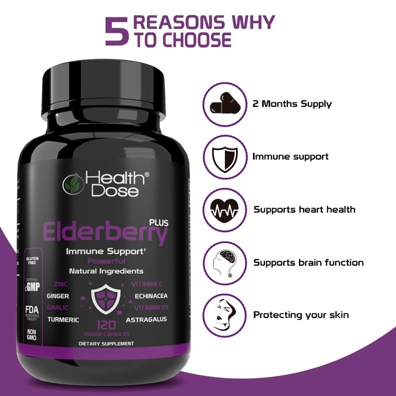 - Health Dose Supply -- 120 Chlorophyll Veggie Capsules | 2 months supply, 1 more month than most brands | For Women & Men | 11 Premium Ingredients | 25mg Zinc | 500mg vitamin C | 50mg vitamin D3 | 60mg Selenium | 1001mg Elderberry Plus Proprietary Blend: Odorless Garlic Powder, Black Elderberry, Turmeric, Ginger Root, Echinacea, Astragalus Root and Black Pepper Fruit Extract | Gluten Free, Non-GMO.