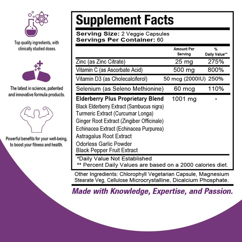 - Knowledge -- We have made our Elderberry plus chlorophyll Veggie Capsules with essential vitamins, antioxidants, ingredients that may help promote and support a healthy heart and skin. Our capsules can help support your immune system all around the year.