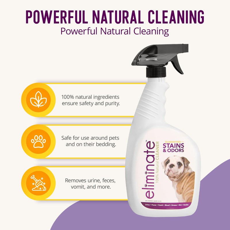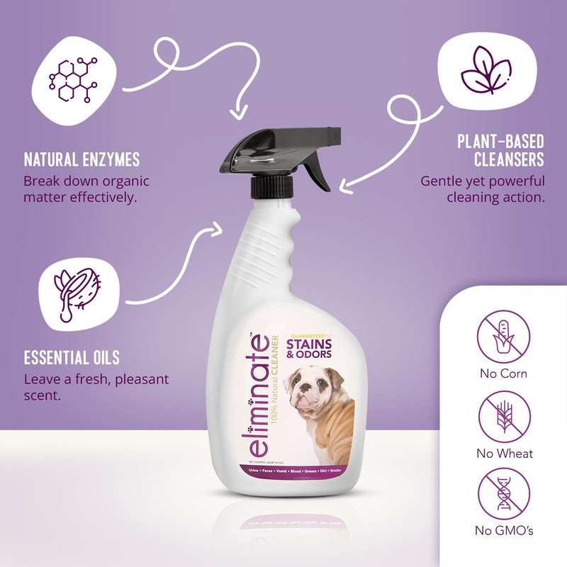 Formulated with 100% natural ingredients, this is Health Extension's most popular stain and odor remover. Thanks to our proprietary blend of natural enzymes and powerful cleaners, Eliminate removes even the toughest pet odors and stains - guaranteed. It works on carpeting, upholstery, pet bedding, tile, vinyl flooring and more. Now you don't need a miracle to get those messy accidents clean!