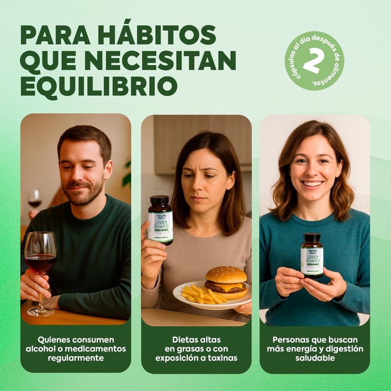 Liver Guard Platinum es ideal para adultos que buscan integrar un suplemento funcional a su rutina diaria. Cada frasco contiene 60 cápsulas veganas, suficiente para 30 días de uso regular con una dosis sencilla de 2 cápsulas por la noche.