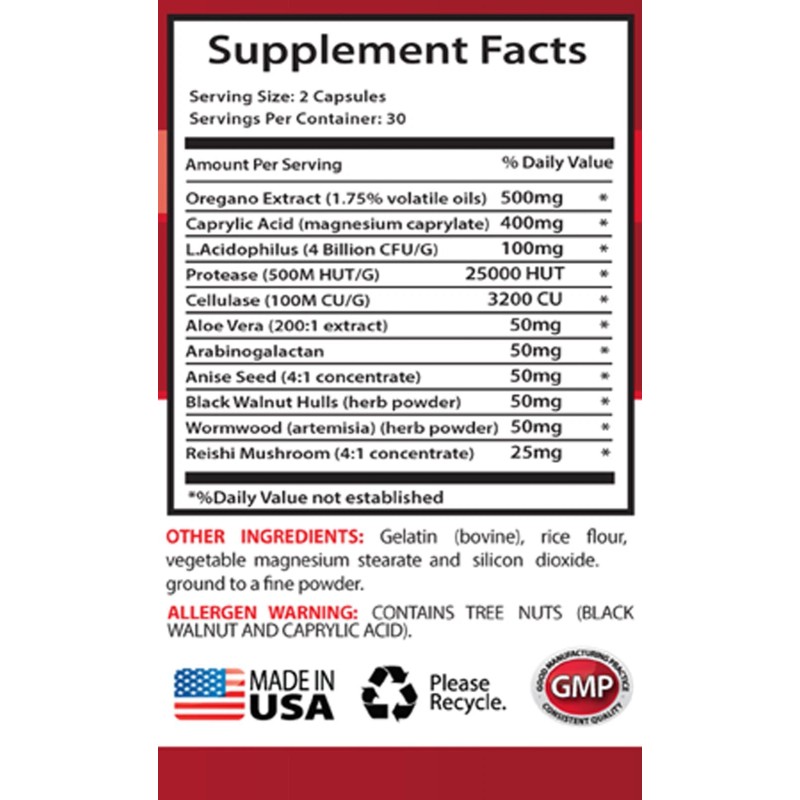 Arabinogalactan, Caprylic Acid, Reishi Mushroom, Oregano Leaf Powder, LactoSpore, Aloe Vera Leaf Gel, Anise Seed, Black Walnut Hull Powder, Wormwood Powder