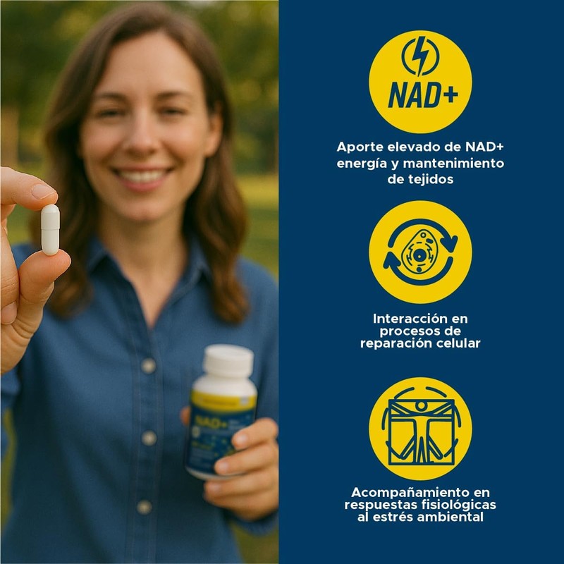 - Contiene NAD+ (500 mg), Quercetina (200 mg) y Resveratrol (200 mg) por porción