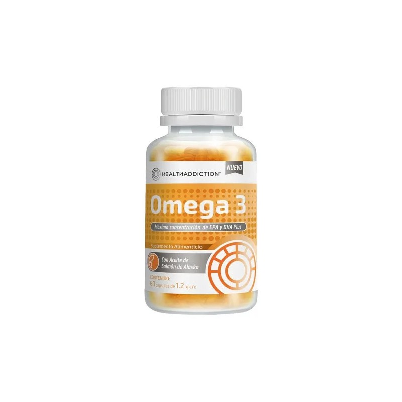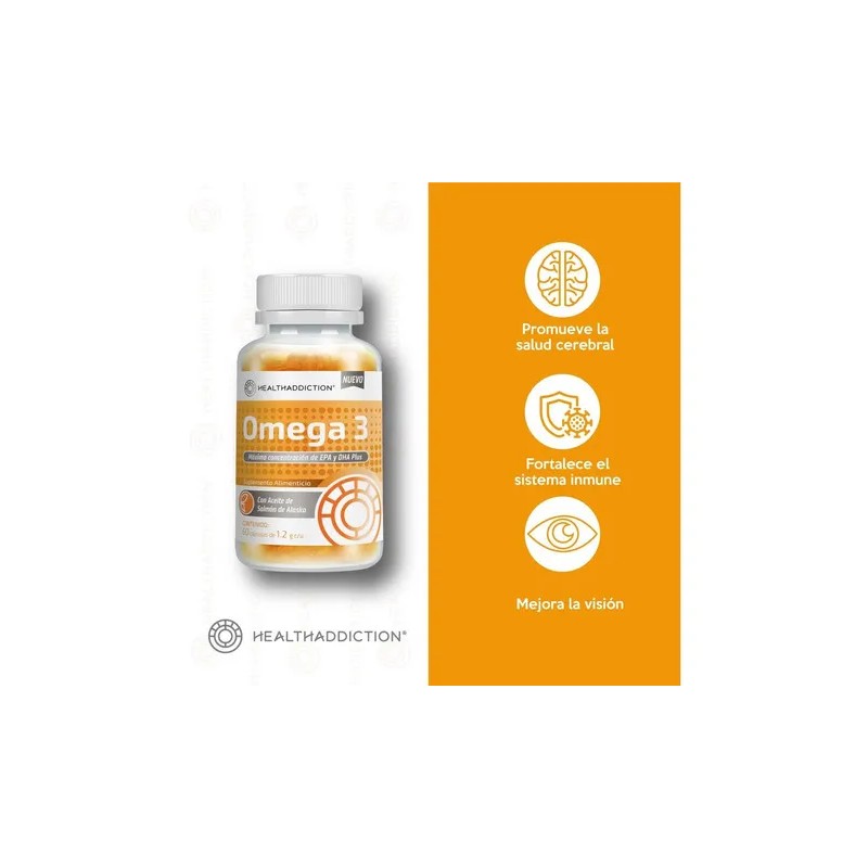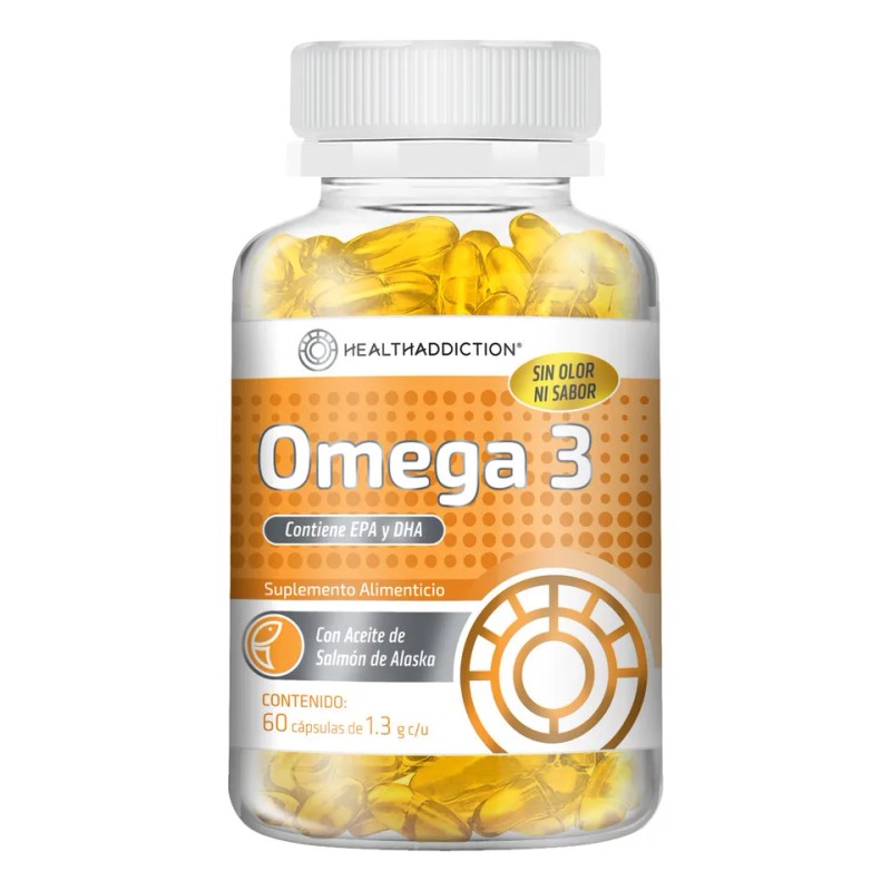 - Descubre el poder de la salud con nuestras cápsulas de Omega 3 HealthAddiction, sin olor ni sabor a pescado. Cada frasco contiene 60 cápsulas de 1.2g, cargadas con altas concentraciones de EPA y DHA para beneficiar tu bienestar general. Diseñadas para evitar el fuerte olor y sabor a pescado común en otras marcas. Omega 3,el aceite de pescado que utilizamos para nuestros productos es libre de mercurio. Ingredientes: Nuestra fórmula de aceite de pescado (Omega 3) de alta calidad, junto con ingredientes adicionales como aceite de linaza, aceite de oliva, aceite de prímula y vitamina E, te proporciona un suplemento completo y equilibrado. Autorizado por COFEPRIS, nuestro producto es sin azúcar y sin gluten. Beneficios: