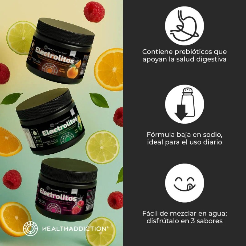 Mantén tu cuerpo hidratado y revitalizado con HealthAddiction Polvo de Electrolitos, una fórmula avanzada diseñada para apoyar tu hidratación y recuperación después de cualquier actividad física. Con una combinación esencial de minerales, vitaminas B, BCAA’s y prebióticos, este suplemento te ayuda a restaurar los electrolitos perdidos mientras cuidas tu digestión y bienestar general.
