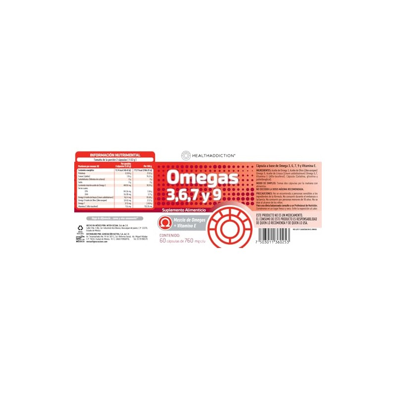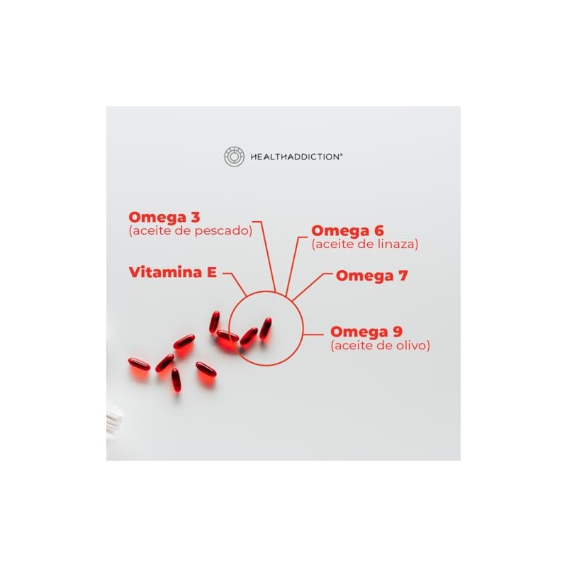 HEALTHADDICTION - Suplemento Omega 3, 6, 7 y 9-60 Cápsulas de 760mg c/u con Aceite de Pescado, Linaza, Oliva y Vitamina E