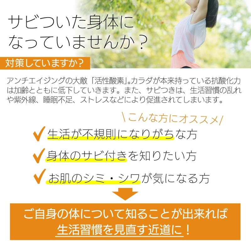 - "Rust Check" is a mailing inspection kit that allows you to easily check the amount of rust on your body by measuring 8-OHdG