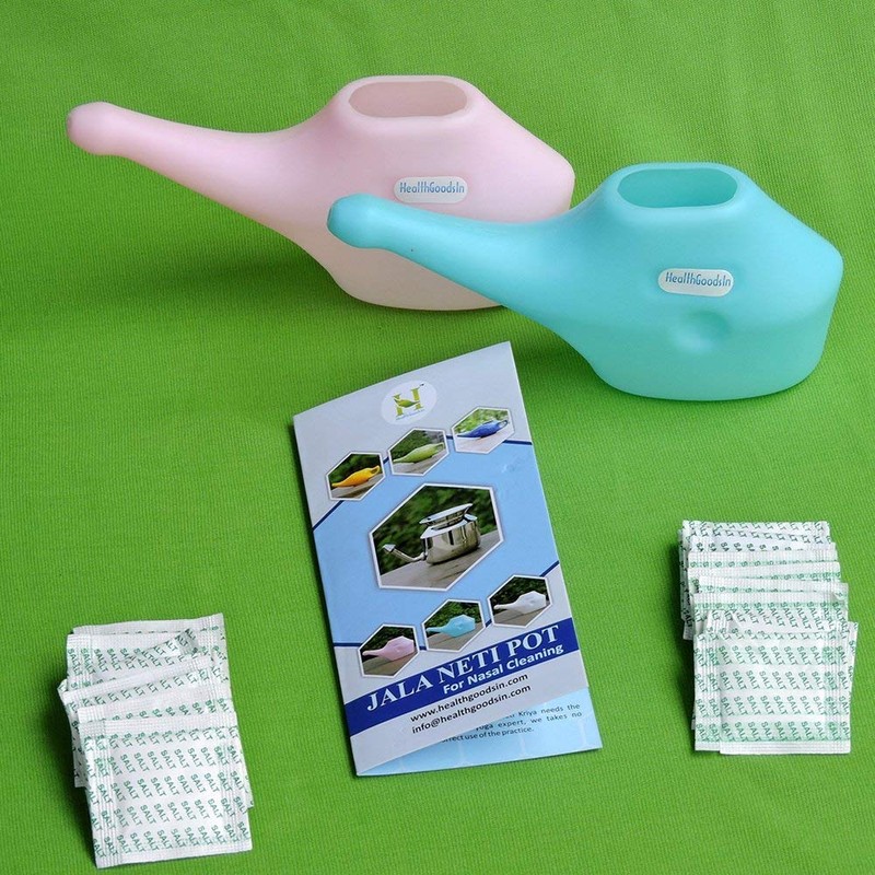 HealthGoodsAU - Set of 2 Traveler’s Plastic Neti Pot for Nasal Cleansing with 10 Sachets Salt + 2 Brushes | Compact and Travel-Friendly Design | Natural Treatment for Sinus, Infection and Congestion
