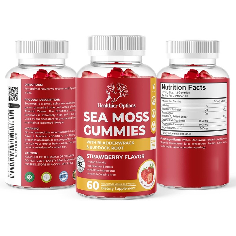 Healthier Options Irish Sea Moss Gummies with Bladderwrack & Burdock Root 5680 Mg | 60 Gummies | Strawberry Flavour | Vitamins & Minerals | Organic, Natural, Vegan, Gluten Free, Non GMO, High Strength