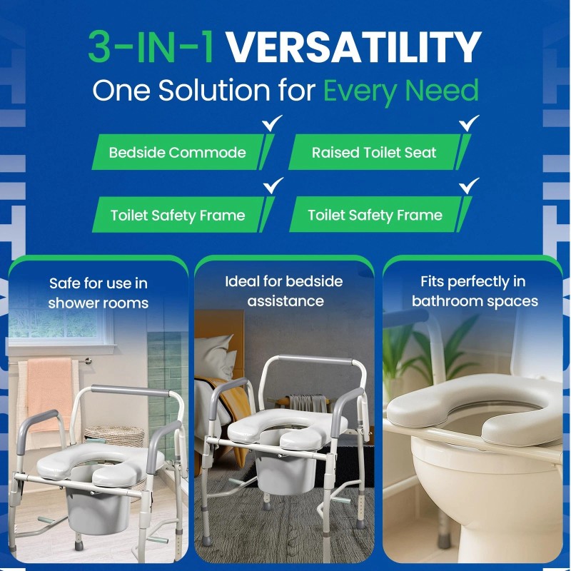- 3-IN-1 MULTIFUNCTIONAL FRAME WITH 300 LBS CAPACITY: Use it as a bedside commode, raised toilet seat, or toilet safety frame. The sturdy powder-coated steel frame supports up to 300 lbs and offers wide seating and padded armrests for comfort and stability.