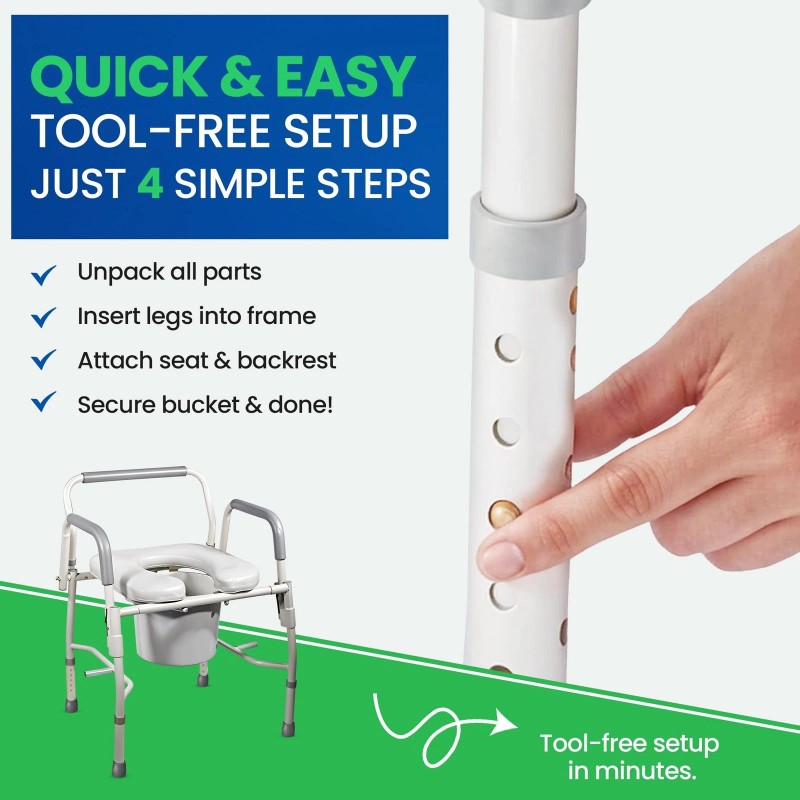 - TOOL-FREE ASSEMBLY IN JUST MINUTES: No tools required! This commode chair assembles in four quick steps, making setup fast and frustration-free. Ideal for caregivers or seniors who want a convenient and ready-to-use solution out of the box.