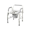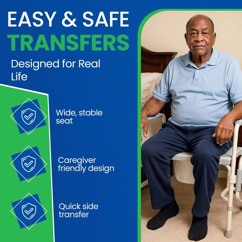 - DROP ARM DESIGN FOR SAFE SIDE TRANSFERS: Equipped with a push-button drop-arm mechanism, this bedside commode ensures smooth lateral transfers from a bed or wheelchairmaking it safer and easier for caregivers and individuals with limited mobility.