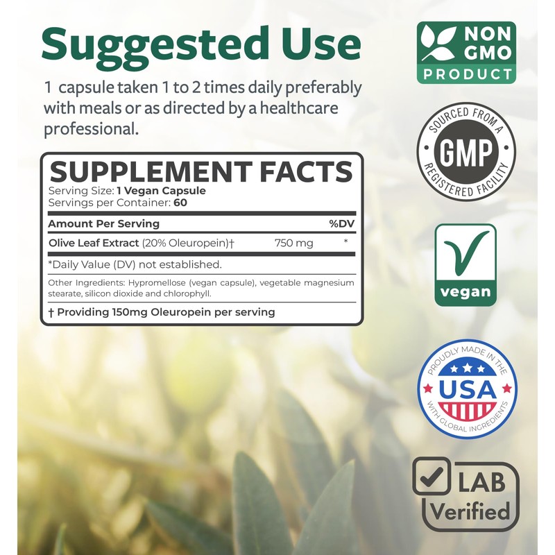 - Packed With Polyphenols: Our olive leaf capsules include 750mg of Olive Leaf Extract with 20% Oleuropein, the most potent component of olive bringing a myriad of health benefits. Responsibly sourced from non-GMO trees, our Olive Leaf Extract cleanly conveys the active ingredients with minimal processing.