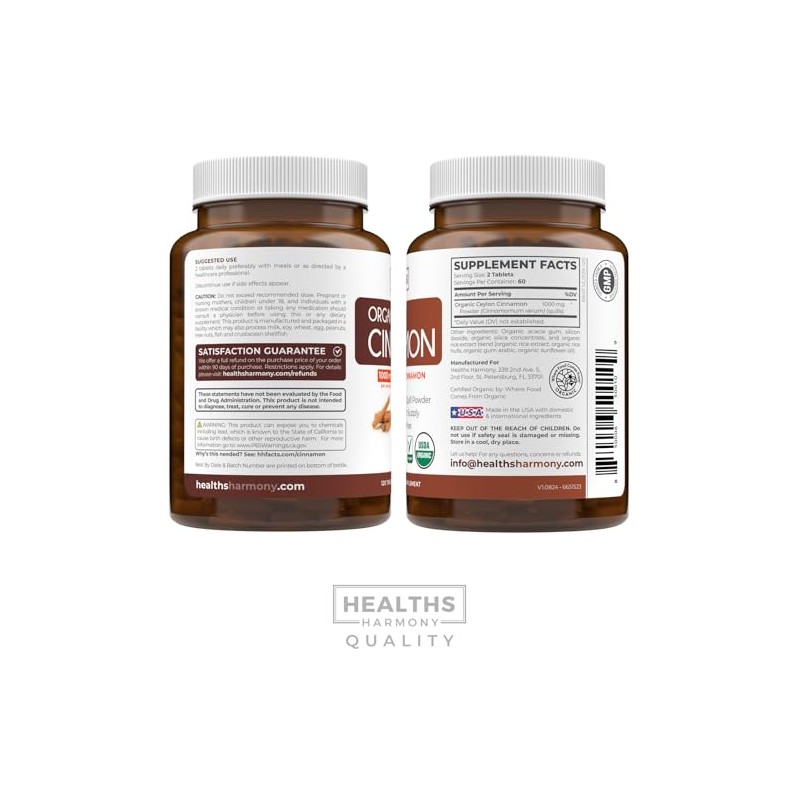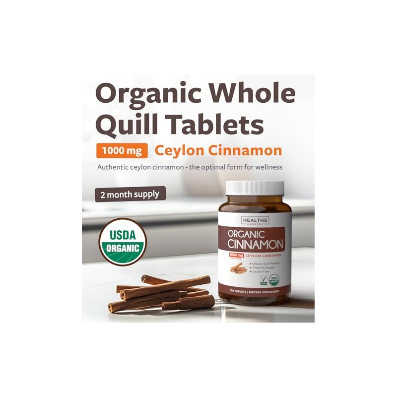 Healths Harmony USDA Organic Ceylon Cinnamon (120 Tablets) 1000mg Cinnamon Quill Powder per Serving - Natural Cinnamon Supplements for Effective Metabolism, Cognative, Joint, Immune Support - (No Capsules or Pills)