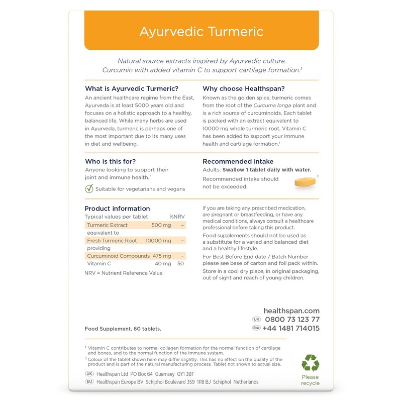 Healthspan Ayurvedic Turmeric | 60 Tablets | 95% high curcuminoid Content | Added Vitamin C | Supports Joint and Immune Health | Vegan Friendly