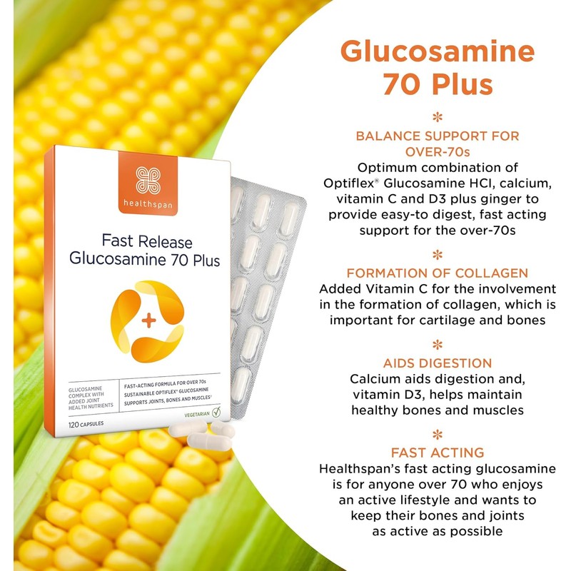 Healthspan Fast Release Glucosamine 70 Plus | 120 Capsules | With Vitamin C, D3, Calcium & Ginger Extract | Supports Joint, Bone & Immune Health | Easy-to-Digest Vegetarian Formula | Tailored for Adults 70+