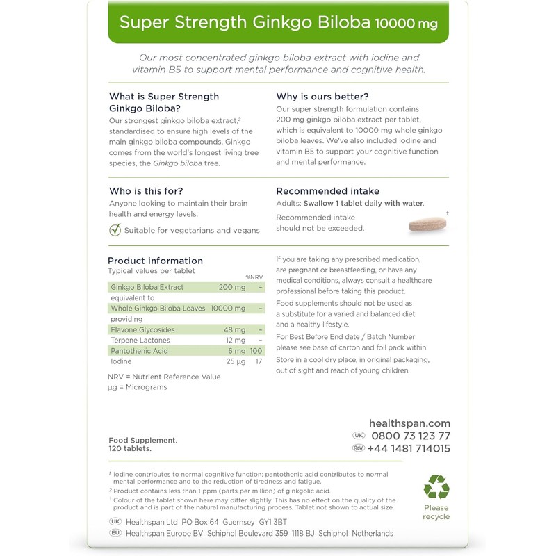 - WHY CHOOSE HEALTHSPAN’S SUPER STRENGTH GINKGO BILOBA? Healthspan use a standardised process to guarantee each tablet contains 200mg extract – equivalent to 10,000mg ginkgo biloba leaves. This high-quality extract contains less than 1ppm (parts per million) of ginkgolic acid. They optimised this formulation with the inclusion of iodine, which is involved in cognitive function, and vitamin B5,known as pantothenic acid, which contributes to mental performance and helps combat tiredness and fatigue.