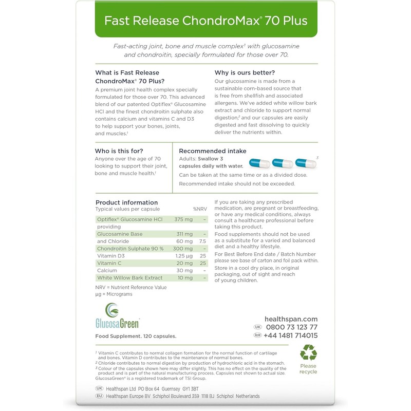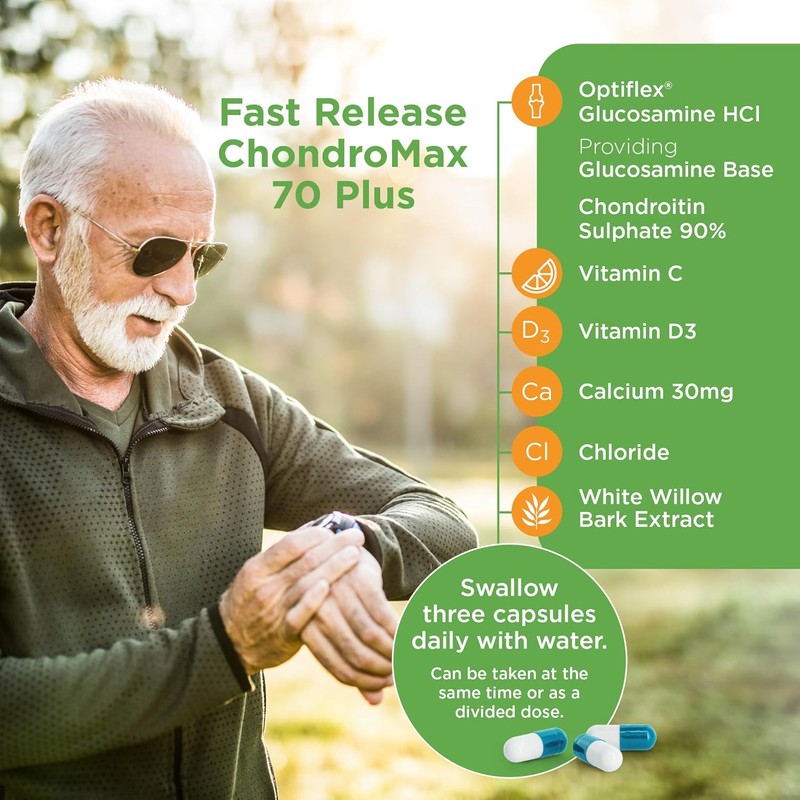 - WHAT IS CHONDROMAX 70 PLUS? A fast-dissolving capsule containing premium joint and bone health nutrients, glucosamine and chondroitin as well as calcium, vitamins C & D and white willow bark extract. Designed to get to action quicker than standard tablets making it ideal for anyone over the age of 70.