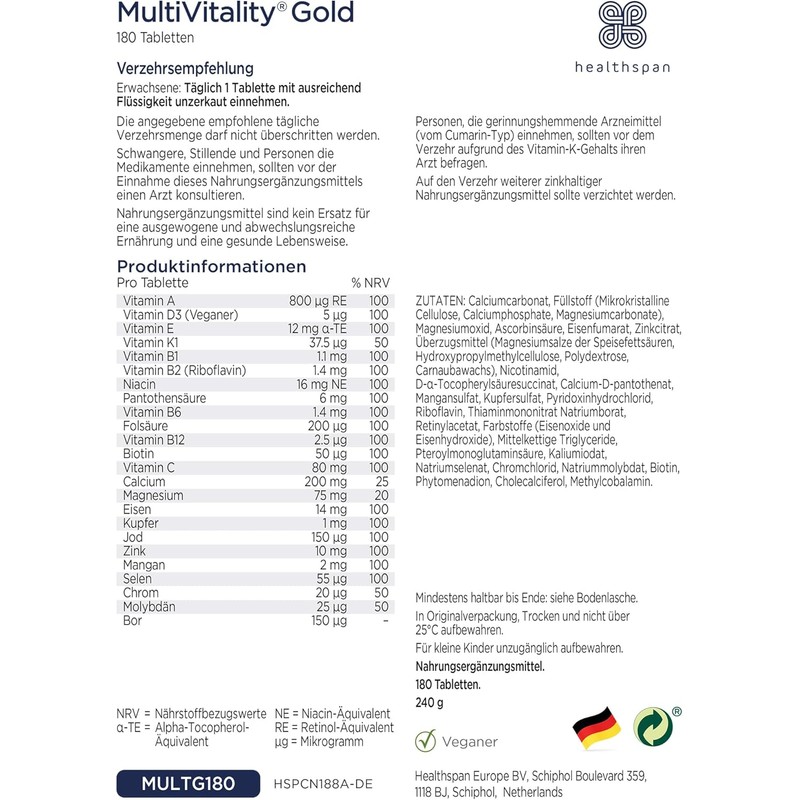 Healthspan Multivitamin Gold A-Z – Wellbeing & Immune Support with Vitamins A, B, C, D, E & K, Calcium, Iron, Magnesium, Zinc, Vegan, 180 Tablets