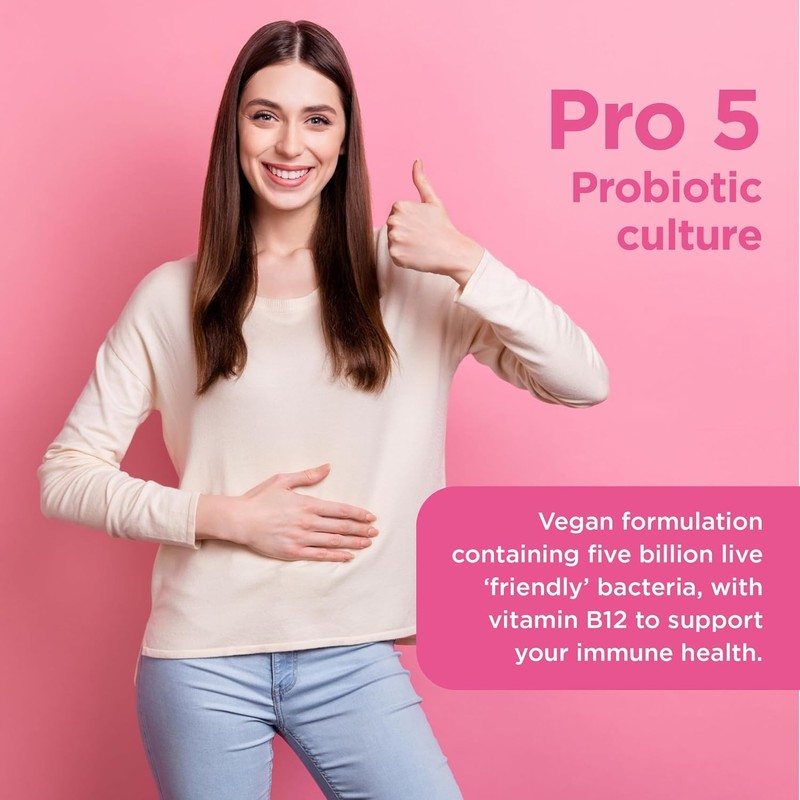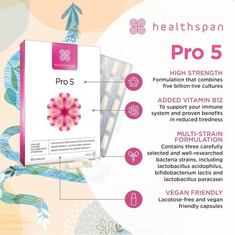 - WHY CHOOSE HEALTHSPAN? Pro 5 is lactose-free, making it suitable for those who have a reduced ability to digest products containing cow’s milk. What’s more, their vegan capsules contain tough bacteria strains that have a long shelf life. Finally, vitamin B12 has been added for its benefits to supporting your immune health, and also has proven benefits in reducing tiredness and fatigue and normal energy-yielding metabolism.